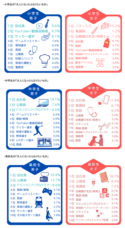 他には、「医師」が、中学生・女子でベスト3にランクインするなどランキングが上がる傾向となりました。高校生・女子でも「薬剤師」がランクインするなど、医療関係の職種がすべての年代で高い人気となりました。